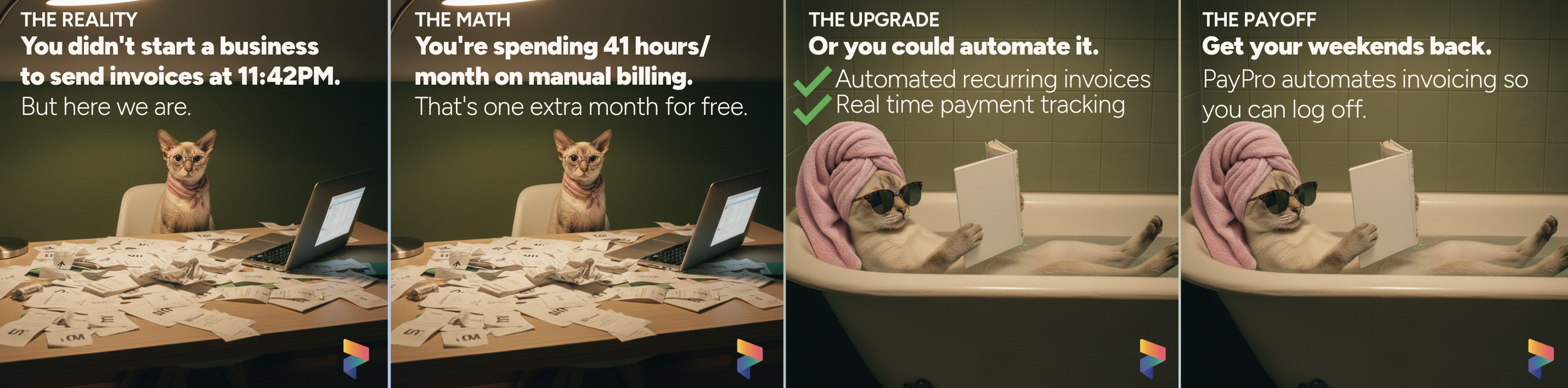 Developed a full-funnel Go-To-Market strategy for PayPro, a B2B payments fintech built for SMBs. Defined positioning, messaging pillars, and customer personas, and crafted a distinct brand voice blending calm competence with dry wit. Built LinkedIn ad concepts, landing page strategy, email marketing material, and conversion optimization plans focused on accelerating cash flow and giving operators their weekends back.